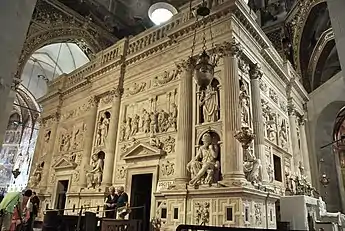 In 1504 Sansovino was invited to Rome by Pope Julius II to make the monument of Cardinal Manzi in Santa Maria in Aracoeli (influenced by the Lombard style of Andrea Bregno) and those of Cardinals Ascanio Maria Sforza and Girolamo Basso della Rovere for the retro-choir of Santa Maria del Popolo. The architectural parts of these monuments and their sculptured foliage are extremely graceful and executed with the most minute delicacy, but the recumbent effigies show the beginning of a serious decline in taste. These tombs became models which for many years were copied by most later sculptors with increasing exaggerations of their defects.[1]