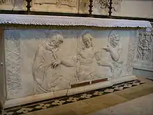 In 1512, while still in Rome, Sansovino executed a very beautiful group of the Madonna and Child with St. Anne, now over one of the side altars in the church of Sant'Agostino. From 1513 to 1528 he was at Loreto, where he cased the outside of the Santa Casa in white marble, covered with reliefs and statuettes in niches between engaged columns; a small part of this sculpture was the work of Andrea, but the greater part was executed by Raffaello da Montelupo, Tribolo and others of his assistants and pupils. Though the general effect is rich and magnificent, the individual pieces of sculpture are both dull and feeble. The earlier reliefs, those by Sansovino himself, are the best.[1]
