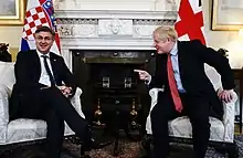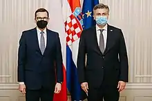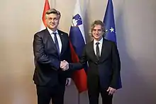 After attending his first European Council summit on 20 October 2016, in an address to the Croatian Parliament, Plenković said that "there is no need for Croatia to build border fences".[44] Plenković's first official foreign visit was to Sarajevo, Bosnia and Herzegovina on 28 October 2016. Plenković said that his government will support Bosnia and Herzegovina on its path towards membership in the European Union. Discussions were held regarding the political rights of Bosnian Croats, mostly in terms of bringing their political rights to the level enjoyed by Bosniaks and Bosnian Serbs.[44][45] In November, he visited Ukraine where he met with Prime Minister Volodymyr Groysman. Plenković expressed support for a peaceful reintegration of the areas of Ukraine under the control of pro-Russian rebels. The two governments established a working group to share Croatia's experience with the reintegration of eastern Slavonia in 1998.[46] The Russian Ministry of Foreign Affairs commented that the visit "raised serious concerns in Russia".[47]