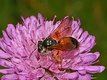 Andrena hattorfiana is an oligolectic species, feeding on cardiac plants (Dipsacaceae); The main pollen source in the area is Knautia arvensis, the secondary pollen source is Knautia dipsacifolia. If the Knautia already wither before the end of the flight time, pollen of Scabiosa columbaria is also collected.[1] It is a solitary bee that can be seen easily from up to 5 meters away. It can be encountered from May through August.