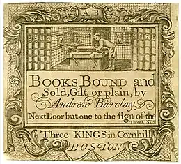 Andrew Barclay (1737–1823) was a Scottish bookbinder who emigrated from Kinross, Fifeshire, to Boston in the British-American colonies in the mid-eighteenth century. As the American Revolutionary War drew near, Barclay sided with the Loyalists and was compelled to leave Boston when the British were driven out in March 1776. Upon leaving Boston he was assigned a command in charge of getting Loyalist refugees out of Boston to Nova Scotia. Soon after, he continued his trade in British-occupied New York for the duration of the war. Bookbinder's trade labels like Barclay's, found on the inside cover of some of his works, are considered a rarity among books printed in colonial America.[1][2][3]