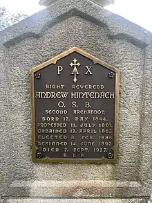 Following his resignation, Hintenach served as chaplain for the Benedictine sisters of Cañon City, Colorado,[7] and then in Erie, Pennsylvania.[8] He retired from active ministry in 1921, living a quiet life until his death on September 7, 1927, at the age of 83. Bishop Hugh Boyle celebrated the Requiem Mass.[3] Andrew Hall, the building containing the monastic refectory at St. Vincent, is named after him.[9]