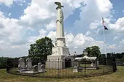 The 26 ft (7.9 m)-tall monument was made in Philadelphia and was paid for by the three surviving Johnson children, Martha, Mary, and Frank.[9] The marble monument depicts the United States Constitution, an eagle, and the Bible.[10] The cost was said to be US$10,000 (equivalent to $303,241 in 2022) with the carving of the eagle costing US$500 (equivalent to $15,162 in 2022) on its own.[11] The base, granite "with a plinth die," is 9 ft 6 in (2.90 m) square. The monument was dedicated in 1878. Planned speakers for the dedication ceremony were former United States and Confederate States congressman George W. Jones and biographer of First Ladies Laura C. Holloway.[9]