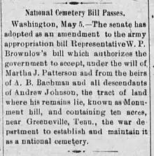 Andrew Johnson's daughter Martha Johnson Patterson willed on September 2, 1898, that the land become a park. She further pushed in 1900 to make the site a national cemetery, so that instead of the Johnson family maintaining it, the federal government would.[3] The United States Congress chose to make the site a National Cemetery in 1906, and by 1908 the United States War Department took control of it. By 1939 there were 100 total graves in the cemetery. On May 23, 1942, control of the cemetery went to the National Park Service.[4][5][6]