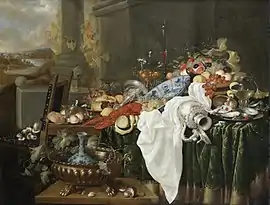 The genre of the pronk still lifes practised by de Coninck had been developed in Antwerp in the 1630s. It was particularly fashionable during the 1640s and 1650s in both Flanders and in Holland. Particularly in Antwerp, Amsterdam and Utrecht various artists created works in this genre. These works typically depict foods and fruits together with a number of precious objects: Venetian glassware, Chinese Wan–li porcelain, silver plates and gilt goblets. The intention of the paintings appears to be to express the status of their owners. At the same time they are also believed to carry a moral lesson, i.e. they can be read as vanitas paintings, which warn about the fleetingness of life and the emptiness of wealth and earthly possessions.[9]