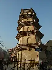 Surviving White Pagoda (center) of Shuixin Chan Temple (right), with the adjacent old residential neighborhood (left) demolished, to make way for new development (such as seen in the background)