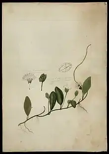 This species was named by the Swiss botanist Jacques Denys Choisy (1799-1859) in 1837.[11] Choisy was, as well as a botanist, a member of the clergy and a theologian/philosopher. The species description was published in Mémoires de la Société de Physique et d'Histoire Naturelle de Genève (Geneva & Paris). Choisy's name superseded that of Nederlander-Austrian botanist Nikolaus Joseph von Jacquin (1727-1817), who named the taxa Convolvulus martinicensis in 1763.