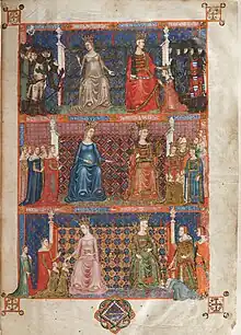Genealogy of the dynasty of the Anjou in Naples, right panel of the opening diptych of the Anjou Bible. Miniature by Cristophoro di Orimina.