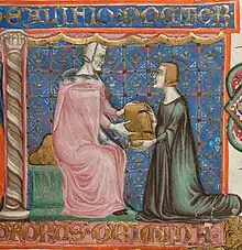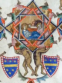 Earlier studies suggest that the intended recipient of the Bible was Nicolo d’Alifio, the advisor of Robert and Joanna, whose coat of arms frequently appears throughout the Bible.[11] The Bible likely came into his possession as a gift from Queen Joanna[10] when she fled to France in 1345. An explicit mention of Nicolo can be found at the end of the manuscript, on folio 309r in the text surrounding the painted miniature, namely: Hec est Blibia (sic) magistri Nicolai de Alifio doctor quam illuminavit de pincello Cristophorus Orimina de Neapoli.[12][13] He had his coat of arms painted over a hundred times over the original coat of arms in the lower border of the miniatures.[11]