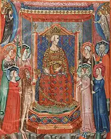 At the time of their engagement in 1333, Joanna and Andreas were seven and six years old, respectively. The marriage took place in the spring of 1342. The marriage agreement stipulated that Andreas and Joanna would become kings, but in his testament drawn up on January 16, 1343, Robert decided to reserve the royal title of queen for his granddaughter. Joanna was crowned queen alone in August 1344 in Santa Chiara, Naples. Andreas was murdered in September 1345.[10] In revenge for his brother's death, Louis I of Hungary forcibly conquered Naples. Joanna fled to Provence, presented herself to the Pope in Avignon to prove her innocence, was acquitted, and returned to Naples two years later to reclaim her throne. She remained a powerful queen of Naples in a period filled with conflict and wars.