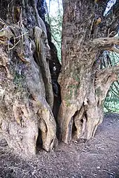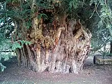 The Ankerwycke Yew is an ancient yew tree close to the ruins of St Mary's Priory, the site of a Benedictine nunnery built in the 12th century, near Wraysbury in Berkshire, England. It is a male tree with a girth of 8 metres (26 ft) at 0.3 metres.[1] The tree is at least 1,400 years old,[2] and could be as old as 2,500 years.[3]