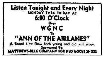 Advertisement for the syndicated Ann of the Airlanes from the September 25, 1950, edition of the Gastonia Gazette (Gastonia, North Carolina) informing listeners of the series on Gastonia's station WGNC.