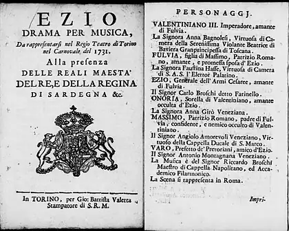 Frontispiece and cast from the libretto of the 1731 production of Riccardo Broschi's Ezio in Turin. Anna is listed under the role of "Onoria, sorella di Valentiniano, amante occulta d'Ezio" ("Onoria, Valentiniano's sister, secretly in love with Ezio") as "La Signora Anna Girò Veneziana" ("Ms Anna Girò, Venetian"). In this production Anna shares the stage with a star-studded cast: the soprano castrato Farinelli, the mezzo-soprano Faustina Hasse (Bordoni), the bass Antonio Montagnana, the tenor Angiolo Amorevoli, all of whom sing in cities and capitals all over Europe.