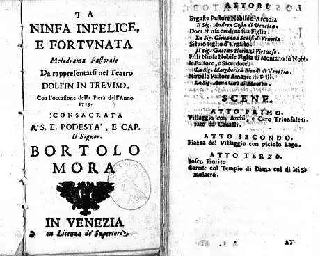 14. "La ninfa infelice e fortunata, melodramma pastorale da rappresentarsi nel Teatro Dolfin in Treviso con l'occasione della Fiera dell'anno 1723. Consacrata a [...] il signor Bortolo Mora". Internet Culturale.