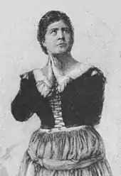 This was followed by engagements at the Schauspielhaus Berlin (1878-1879), where she made her debut as The Maid of Orleans, and in Frankfurt (1880-1883). In addition, Haverland made numerous guest appearances with the ensemble of the Meiningen Court Theatre, including tours to London and St. Petersburg. Another engagement led her to the Deutsche Theater Berlin in 1883, where she played beside Josef Kainz. Contemporaries praised her performance of Antigone, Iphigenia, Sappho and Medea.[1] In 1892, Haverland made a guest appearance in New York City, where she played the leading role in Ibsen's Hedda Gabler at the Amberg's Theatre. It was the first German performance of the play in America; Ibsen chose himself Haverland as the actress when the play was first performed at the Lessing Theatre in Berlin in February 1891.[3][4] Haverland was in contact with other artists of her time, including Theodor Fontane. In the Berlin novel Allerlei Glück, which has remained in fragment form, Fontane placed the character of the theatre-loving Bertha, who is enthusiastic about the role of Iphigenie and chats with her friend Hanke about various plays, on a posthumous journey to Haverland.[5] Johannes Schilling took the arm of Germania of the Niederwalddenkmal from Haverland's arm as a model.[6]