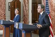 Baerbock appears to have taken a pro-Israel stance in response to the 2021 Israel–Palestine crisis.[85] She called the number of UN resolutions criticizing Israel "absurd compared to resolutions against other states."[86] Baerbock expressed "concern" over the legal and constitutional implications of the proposed 2023 Israeli judicial reform.[87]