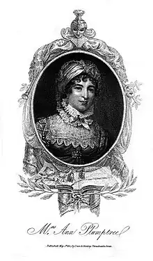 Anne was born in Norwich. She was the second daughter of Robert Plumptre who became President of Queens' College, Cambridge and Anne née Newcome.[1] Along with her younger sister Annabella [Bell] Plumptre (1769–1838) she received an excellent education and became active in the Enfield circle, a local group of literati. Her brother James Plumptre was known as a dramatist.[2] Later she became involved in politics during the period of the French Revolution. She published her own fiction, travel writing and political enquiry, as well as many translations of letters, travel writing, drama, and other genres.[3]