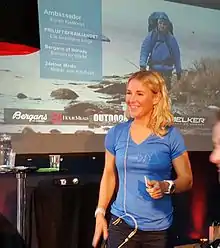 Pompe has been sport climbing since she was 13 years old.[6] In May 2011, she climbed Mount Everest[7] as the first Swedish woman to summit from the north side. Despite marketing her attempt as a climb without oxygen, she did end up using bottled oxygen in order to make the summit. She has also climbed all seven Seven Summits (including Puncak Jaya, and the last one Mount Vinson in January 2016).[8]