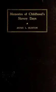 Annie L. Burton (c. 1858 – ?) was an African American memoirist, whose life story is captured in her 1909 autobiography and slave narrative Memories of Childhood's Slavery Days.[1] Her date of death is uncertain.