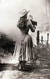 During her first engagement with the Buffalo Bill show, Oakley experienced a tense professional rivalry with rifle sharpshooter Lillian Smith. Smith was eleven years younger than Oakley, age 15 at the time she joined the show in 1886, which may have been a primary reason for Oakley to alter her age as six years younger in later years due to Smith's press coverage becoming as favorable as hers.[33] Oakley temporarily left the Buffalo Bill show but returned two years later, after Smith departed, in time for the Paris Exposition of 1889.[34] This three-year tour only cemented Oakley as America's first female star. She earned more than any other performer in the show, except Buffalo Bill himself. She also performed in many shows on the side for extra income.[34] During her lifetime, the theatre business began referring to complimentary tickets as "Annie Oakleys". Such tickets traditionally have holes punched into them (to prevent them from being resold), reminiscent of the playing cards Oakley shot through during her sharpshooting act.