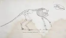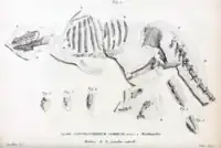 In 1812, Cuvier published his drawing of a skeletal reconstruction of A. commune based on known fossil remains of the species including the aforementioned incomplete skeletons. Based on the robust build of the mammal species, he hypothesized that its body structure was similar to otters except for its legs, that it was adapted for semi-aquatic life by swimming for consumption of aquatic plants, lacking long ears similar to semi-aquatic mammals, and living in marshy environments. Cuvier suggested that its lifestyle was therefore similar to semi-aquatic quadrupedal mammals like hippopotamuses and muroid rodents. He thought that in comparison, other species of Anoplotherium such as A. medium and A. minus were adapted for terrestrial behaviours and mixed feeding (browsing and grazing).[16][17] Today, the reconstruction for the skeletal anatomy has aged well, mostly standing the test of time since 1812.[18] Anoplotherium and Palaeotherium were also depicted in 1822 drawings by the French palaeontologist Charles Léopold Laurillard under the direction of Cuvier, although the restorations were not as detailed as Cuvier's.[19]