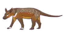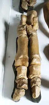 Cuvier named three species of Anoplotherium in the same year, the first of which was the "sheep-sized" A. commune and the other three of which were "smaller species" that he named A. medium, A. minus, and A. minimum. The etymology of the species name A. commune refers to how "common" fossils of the species were while the etymologies of the other two species were based on sizes compared to A. commune.[lower-alpha 1] He also attributed a cloven hoof (or didactyl hoof) to A. commune since the specimen appeared to be large-sized. He thought that Anoplotherium had didactyl hooves instead of tridactyl hooves, which would have separated it from Palaeotherium. Based on the hooves and dentition, he concluded that Anoplotherium was similar to ruminants or camelids.[4][5] However, in 1807, Cuvier found out that Anoplotherium commune had three toes on its hind limbs, although the third index toes were of smaller sizes compared to the other two.[6]