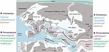 Anoplotherium is the type genus of the Anoplotheriidae, a Paleogene artiodactyl family endemic to western Europe that lived from the middle Eocene to the early Oligocene (~44 to 30 Ma, possible earliest record at ~48 Ma). The exact evolutionary origins and dispersals of the anoplotheriids are uncertain, but they exclusively resided within the continent when it was an archipelago that was isolated by seaway barriers from other regions such as Balkanatolia and the rest of eastern Eurasia. The Anoplotheriidae's relations with other members of the Artiodactyla are not well-resolved, with some determining it to be either a tylopod (which includes camelids and merycoidodonts of the Paleogene) or a close relative to the infraorder and some others believing that it may have been closer to the Ruminantia (which includes tragulids and other close Paleogene relatives).[46][44]