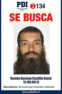 In 2012, one of the cult members, 25-year-old Natalia Guerra,[2] became pregnant with his child, who he believed to be the Antichrist.[1] Castillo's infant son was ultimately immolated in a bonfire on 23 November of that year as a human sacrifice, to prevent the supposedly incoming end of the world on 21 December 2012.[2] After Chilean authorities were informed of the murder in April 2013, a nationwide manhunt headed by the Investigations Police of Chile began, which soon spread to neighboring Bolivia and Peru, the latter of which where he hung himself to evade capture.