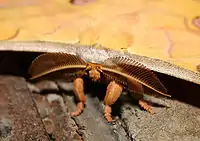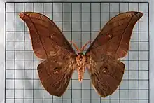 Antheraea yamamai, the Japanese silk moth or Japanese oak silkmoth (Japanese: yamamayu(ga) (山繭(蛾)・ヤママユ(ガ)) or tensan (天蚕)) is a moth of the family Saturniidae. It is endemic to east Asia, but has been imported to Europe for tussar silk production and is now found in southeastern Europe, mainly in Austria, northeastern Italy, and the Balkans. It seems to be spreading north and a population has been reported near Deggendorf and Passau in Germany.[2] The species was first described by Félix Édouard Guérin-Méneville in 1861. It has been hybridized artificially with Antheraea polyphemus of North America.[3]