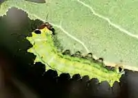 The larva mainly feed on Quercus species, but have also been reported on Fagus sylvatica, Castanea sativa, Carpinus, Rosa, and Crataegus.