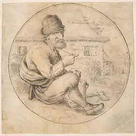 The remaining quarter of his drawings consist mainly of genre scenes: soldiers in action or satirical peasant figures engaging in activities such as singing, reading and smoking. It is believed that each of the figures represent one of the five senses. Examples are the three drawings in the Metropolitan Museum of Art in New York, which symbolize Hearing, Smell and Sight.[2]