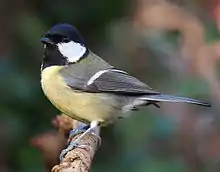 The great tit, Parus major, is a passerine bird belonging to the family Paridae. Passerines are commonly referred to as songbirds, with most passerines singing multiple species-specific songs making a repertoire.[4] Birds can be ranked depending on how they perform the songs in their repertoire. On one side, there are birds that sing with eventual variety and have small repertoires, meaning that each song type in their repertoire is repeated before they switch to a different song type.[4]