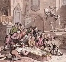 Thomas Rowlandson's caricature, Death and the Antiquaries, 1816. A group of antiquaries cluster eagerly around the exhumed corpse of a king, oblivious to the jealous figure of Death aiming his dart at one of them. The image was inspired by the opening of the tomb of Edward I in Westminster Abbey by the Society of Antiquaries in 1774.