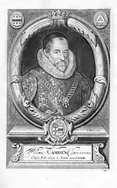 William Camden (1551–1623), author of the Britannia, wearing the tabard and chain of office of Clarenceux King of Arms. Originally published in the 1695 edition of Britannia.