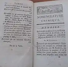 First page of a 1787 copy of "Méthode de Nomenclature Chimique"