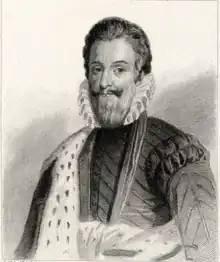 During the reign of Henri, the creation of new chevaliers of the Ordre de Saint-Michel largely ceased. However, he occasionally continued to bestow the honour on his favourites. As such, in 1577, the honour went to the Comte de Brienne and Beauvais-Nangis.[23] During the sixth civil war in 1577, Beauvais-Nangis entered dispute with another favourite of the king, Saint-Luc. Beauvais-Nangis was very reluctant to hand over the command of the Picard regiments to Saint-Luc. He stalled the handover as much as he could, maintaining the command of the regiments during the siege of Brouage in the summer of that year.[22][24] During the Brouage siege, two favourites of Henri—La Guiche and the Comte de Caylus—were captured by a Protestant commander. The men looked to Beauvais-Nangis to secure their release, however he was unable to do so, and they remained in captivity until peace was made three months later.[25] Saint-Luc eventually gave up on acquiring the troops from Beauvais-Nangis and sold the rights to lead the company to Beauvais-Nangis, using the sum he raised from the sale to aid in his purchase of the government of Brouage.[26]