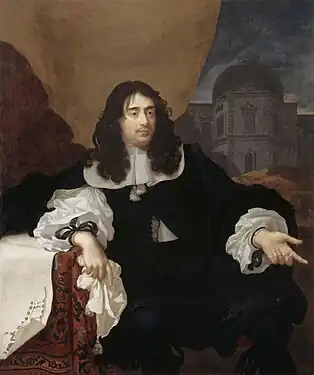 - ↑ The subject of this portrait was identified as Louis Le Vau in 1955 by Albert Laprade, who recognized the plan as that of the southwest corner of the old Louvre, that is the Bathing Apartment of the Queen Mother Anne d'Autriche, remodeled by Le Vau in the summer of 1661, and the building illustrated in the background as the pavilion at the north end of the Louvre's Petite Galerie (see Galerie d'Apollon), constructed after the fire of 1 February 1661 (see also Laprade 1960, chapter 3, plate 1).
