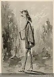 After only a year, he quit and became an illustrator for the political daily El Correo Literario, which was critical of the Conservative Republic. Although handicapped by old, malfunctioning equipment and a dearth of decent supplies, he created a huge number of portrait caricatures of notable people (including his old nemesis, Ciccarelli), with humorous captions or poems by Guillermo Matta.[1] As might be expected, there was much official opposition. President Manuel Montt called on them to stop publishing "esos monos groseros" (those crude monkeys). After less than a year of operation, they had to close up shop, at least temporarily.