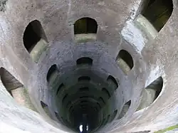Sangallo was also a noted military architect, working on the fortifications of numerous cities such as Parma, Piacenza, Ancona and Orvieto. In Orvieto, he was also tasked by Pope Clement VII with building a well, called Saint Patrick's Well, noted as a marvel of engineering. Its double-helix ramps around a central open shaft allowed oxen carrying water to go down via one of the ramps and up via the other without having to turn around. Despite its 175-foot depth, the ramps are well lit through windows cut into the centre section. Possibly an inspiration for the design, the Well of Joseph in the Cairo Citadel also featured a double spiral staircase.[3]