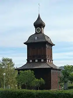The bell tower was built in 1759 by Per Zakrisson (1723–1780) of Anundsjö. Zakrisson was a craftsman, carpenter, wood carver, blacksmith, and mechanic. He was most noted as a church builder. Above the belfry stands a memorial to him set up in 1959 for the 200th anniversary of the building of the tower. The tower has two bells.[2]