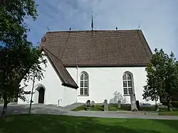 The present church was built in 1437 and is a good example of northern late medieval church architecture. It has a simple rectangular floor plan and consists of nave, porch to the south and the vestry in the north. The church is constructed of stone with a roof covered with thick wood paneling. Entrance is through the porch. The church still has its medieval appearance. The church has paintings on the ceiling that were previously painted over with white paint. The original paintings were revealed in a restoration in 1952.[1]
