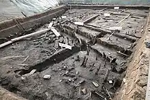 The Aoyakamijichi site was discovered along with the construction of the Aoya-Hago Road and the Tottori Prefectural Road No. 274 Aoya Station Ide Line. Archaeological excavations since 1998 have revealed that the residential area was about 200 meters in diameter, and that paddy fields extended on the south and west sides for over 700 meters on the long side to about 300 meters on the short side, for a total of total of approximately 55,000 square meters. The settlement area began in the latter half of the early Yayoi period, expanded significantly in the latter half of the middle Yayoi period, continued to the latter period, and suddenly disappeared at the beginning of the early Kofun period. The overlapping foundations of numerous pillar-supported buildings and underground storage pits were found. However, the most unusual feature is a revetment facility made of massive cedar planks from the middle and latter half of the Yayoi period that extends across the southeastern part of the ruins. It was made from huge boards with a length of 260 cm and a width of 70 cm arranged side by side and fixed with stakes. In the later period, a ditch was built to surround the high range of the terrain, and rows of sheet piles were driven in many layers here. Some of these revetment facilities include planks that appear to have been converted from building materials. The site also yielded a very large number of artifacts. In addition to finished and unfinished woodware, bone and horn tools, animal bones, and metalware such as ironware and bronze ware, more than 5,300 human remains were also unearthed. DNA testing on four of these remains revealed that two of the remains had Haplogroup C-M8 markers, which are more commonly found among the Jōmon period. Among the late Yayoi period bones found in a ditch on the east side of the site, 110 had wound marks. In addition, two bones are found to have lesions caused by vertebral caries, making these the oldest known tuberculosis case in Japan. Three skulls were found to contain organic materials that are the remnants of brain material. Another important find was a 120-cm fragment of a wooden shield made from momi fir, which had been painted green. This is the earliest known use of green pigment in East Asia. As many as 35 coprolites were unearthed, which also provides important knowledge for restoring the lives of people in the Yayoi period. Many of the relics indicate a relationship with the Asian continent, hinting at trade and cultural exchange during the Yayoi period across then Sea of Japan.[2]