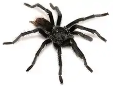 Aphonopelma marxi is generally dark brown to black in color, very hairy, with some orange to red hairs on the abdomen. The mature male's carapace ranges from 8.3 to 10.5 mm (0.33 to 0.41 in) long, the mature female being larger, with a carapace from 13.5 to 15.3 mm (0.53 to 0.60 in) long.[2] The total body length of a female, including the chelicerae, is around 35 mm (1.4 in).[3] A. marxi can be distinguished from other species of the genus living in the same places by its dark color, overall hairy appearance, size and habitat. In males, the ratio of the length of the femur of the first leg to the length of the metatarsus of the same leg is greater than 1.69, whereas in similar species the ratio is smaller. In females, the ratio of the length of the femur of the first leg to the length of metatarsus of the third leg is greater than 1.76, being smaller in similar species.[2]