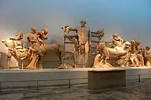 The sculptures of the west pediment depicted the battle of the Lapiths against the Centaurs, following the wedding feast of Peirithous and Hippodamia. The battle of the Lapiths (legendary inhabitants of Thessaly) against the Centaurs (wild forest inhabitants with a human upper half and the body of a horse) frequently acted as a mythological metaphor for the conflicts between the Greeks and the Barbarians. Most of the figures in this turbulent battle scene were discovered during the German excavations of 1875, led by the archaeologist Georg Treu.