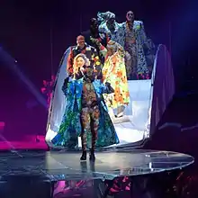 "Applause" was performed live for the first time at the 2013 MTV Video Music Awards.[98] Gaga began the performance wearing a square-shaped head piece and an all-white cape as pre-recorded boos were quickly replaced by sound of cheers. Gaga then glided across the stage and was assisted by her dancers as she changed into a black sequin leotard and performed the intricate choreography seen in the song's corresponding music video. Throughout the performance she cycled through costumes and wigs she had previously employed throughout her career.[99] She danced with a Jeff Koons blue gazing ball, and had her face painted in the style of the single cover by one of her dancers. Gaga concluded the performance by emerging from behind jungle-like scenery dressed in a seashell bikini, big blonde curly wig and took a bow.[100] The singer collaborated with theater director Robert Wilson on the performance. His designed set featured a shimmering white jungle background with letters spelling "Applause" suspended from tree branches.[101] Gaga relegated the performance as a "metaphor" for herself and felt it was "the most physically challenging performance I've done, ever".[102]