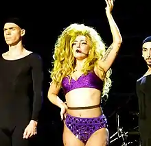 Gaga reprised "Applause" at the South by Southwest (SXSW) music festival in Austin, Texas in March 2014, where she was joined onstage by her opening acts and friends, the Dirty Pearls, Semi Precious Weapons and Lady Starlight.[111] "Applause" was later included in the setlist of Gaga's Manhattan residency show at Roseland Ballroom.[112] Gaga appeared in a purple sequin studded two-piece with a matching face-mask and green colored wig during the performance.[113] The song was included on the set list of her ArtRave: The Artpop Ball tour. Following "Bad Romance", Gaga joined her dancers on the catwalks, where she performed a choreographed dance routine in a rave inspired outfit.[114][115] Brad Wheeler of The Globe and Mail described Gaga's performance as "unstoppable and enthralling" but criticized the show's production for drowning out Gaga's vocals and said: "She’s not like Jennifer Lopez or Britney Spears or even Madonna, who were raised as dancers and lime-lighters, not musicians. And yet, she prefers to perform spectacles that, by design, fail to showcase all of her abilities."[116]
