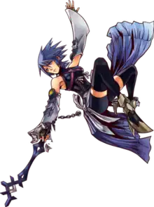In contrast to Terra and Ventus, Aqua did not have a reference point for the characters design, leading Nomura to create a completely new character from scratch. Her outfit was based on Terra's Japanese-inspired clothes which are meant to expand the student-and-teacher bond shown in the game.[1][16] Aqua's outfit was altered three times during the game's development. Nomura felt the open back of Aqua's outfit presented at the Tokyo Game Show 2009 was too revealing and modified the design to be more conservative.[17] As with Terra and Ventus, the making of Aqua's outfit created issues for Nomura like how she would be able to summon her armor. To remedy this, an "X" was added to her clothes as a means to activate her armor. When designing Aqua, Nomura was worried the character would be unpopular due to her weak connection with other Kingdom Hearts characters. This led to a push to make the character distinctly "strong", which Nomura also did with Xion for Kingdom Hearts 358/2 Days, but in a different way. While Xion was also a "brave girl", Nomura wanted to retain Aqua's feminine qualities along with her strength. After design was completed, Nomura was still unsure of how Aqua would be received. After the game's release, however, Nomura noted her popularity with fans, and referenced Megumi Toyoguchi's work as her voice actress as one of the reasons. Toyoguchi had already worked with Nomura in Final Fantasy X-2 voicing Paine, one of the game's protagonists. While Toyoguchi used a low tone with Paine, she used a tone closer to her original voice when performing as Aqua, which Nomura praised.[1]