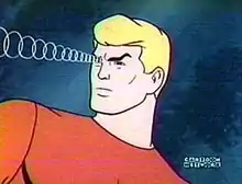 Aquaman as he appears in The Superman/Aquaman Hour of Adventure. Concentric rings are shown coming from his forehead as a special effect related to his telepathic control of and communication with fish.