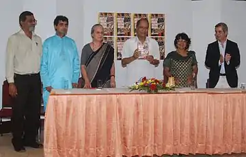 At Panjim, Goa, April 2011, during the launch of the book on Aquino de Bragança. From left, Miguel Braganza (a relative), historian Prajal Sakhardande, littérateur Dr Maria Aurora Couto, former Indian federal minister Eduardo Faleiro, author Silvia Bragança and Portuguese Consul-General in Goa Dr Antonio Costa Sabido.