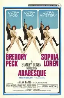 Arabesque is a 1966 American comedy thriller spy film directed by Stanley Donen and starring Gregory Peck and Sophia Loren, written by Julian Mitchell, Stanley Price, and Peter Stone based on The Cipher, a 1961 novel by Alex Gordon (pseudonym of Gordon Cotler). The film, along with Donen's immediately prior film Charade (1963), is usually described as being "Hitchcockian", as it features as a protagonist an innocent and ordinary man thrust into dangerous and extraordinary situations. It was the last film of that genre which Donen would make.[4]